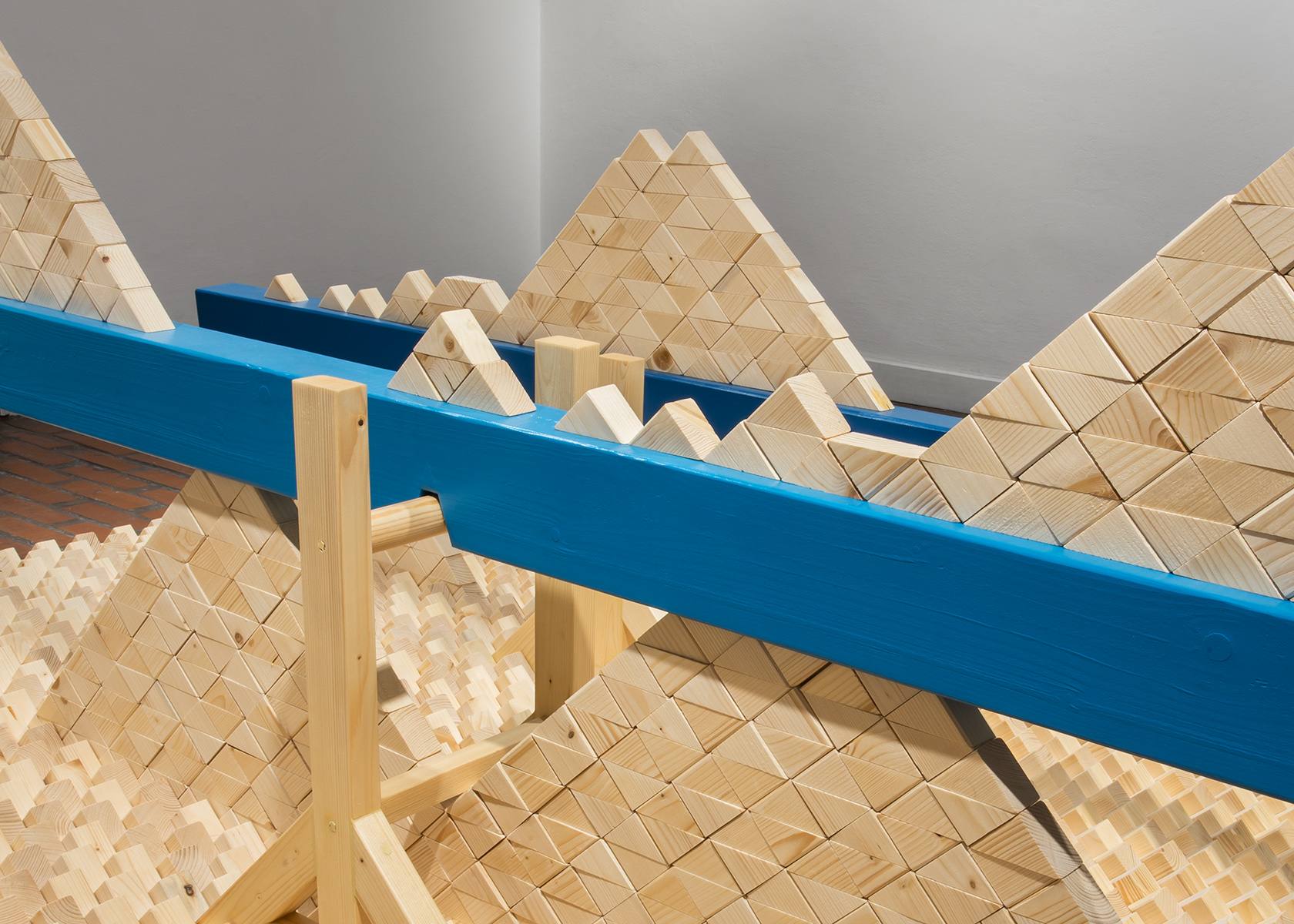 Főként vizuális szempontok miatt használtam a kéket. Szerettem volna egy határozott színt, amely összeköti a kiállítás tárgyait, és kellő karaktert ad a munkáknak. A kék adta magát, mivel a Felfüggesztett vízszintes című műhöz használt szivacsot eleve ebben a színben gyártották, amely gyermekkorom fröccsöntött csúszdáinak a színvilágát idézte föl. Később a nézői értelmezéseket olvasva – melyek megfogalmazására szintén lehetőséget kínál a kiállítás – rájöttem, hogy ez a színválasztás mennyire erős befolyásoló hatással rendelkezik. Többen is a vízre asszociáltak a kék felületek láttán, és ebből interpretációkat bontottak ki, amelyek nekem egyáltalán nem jutottak eszembe, pedig a legtöbb esetben tényleg relevánsak.