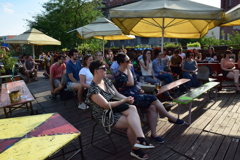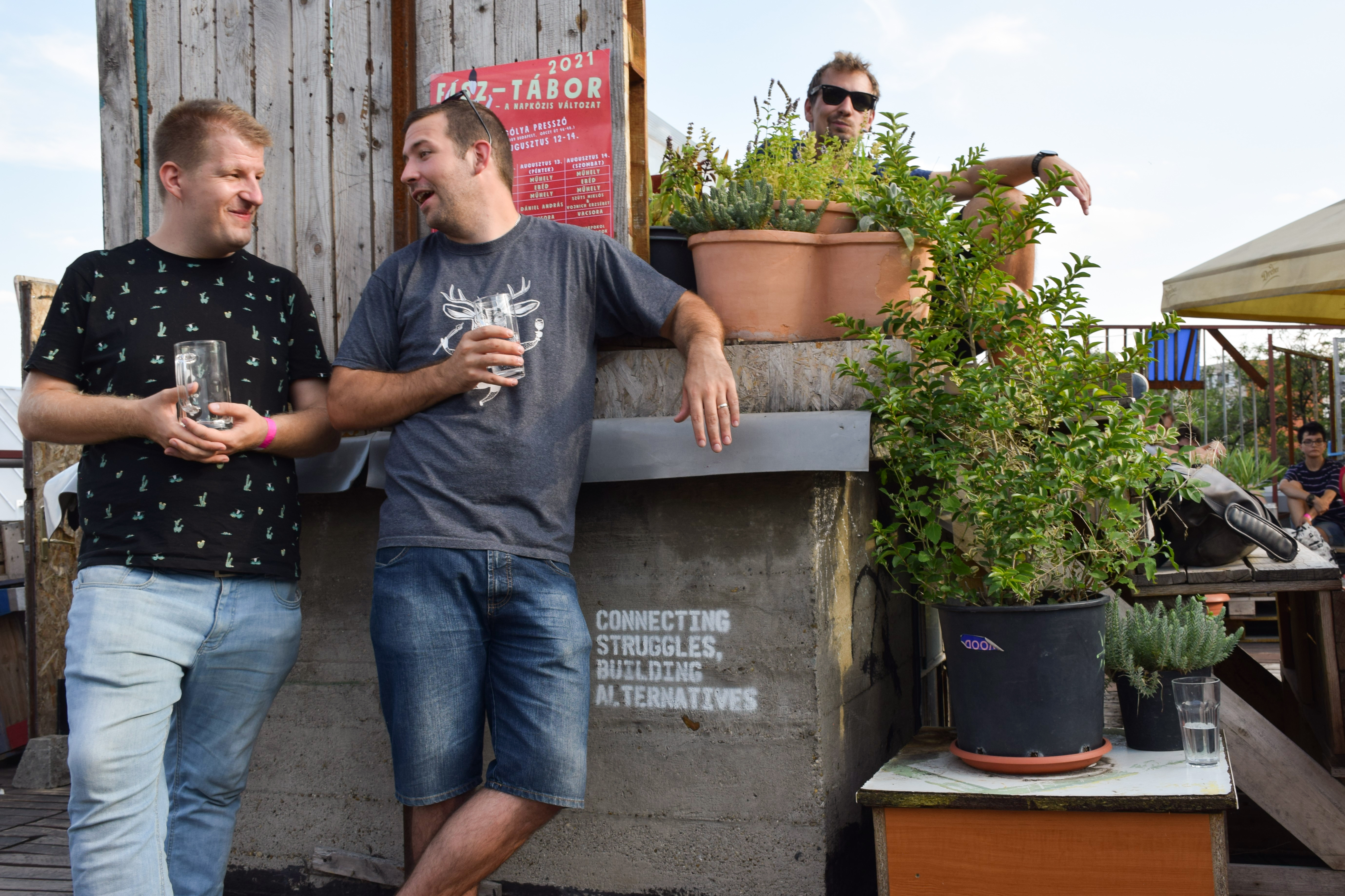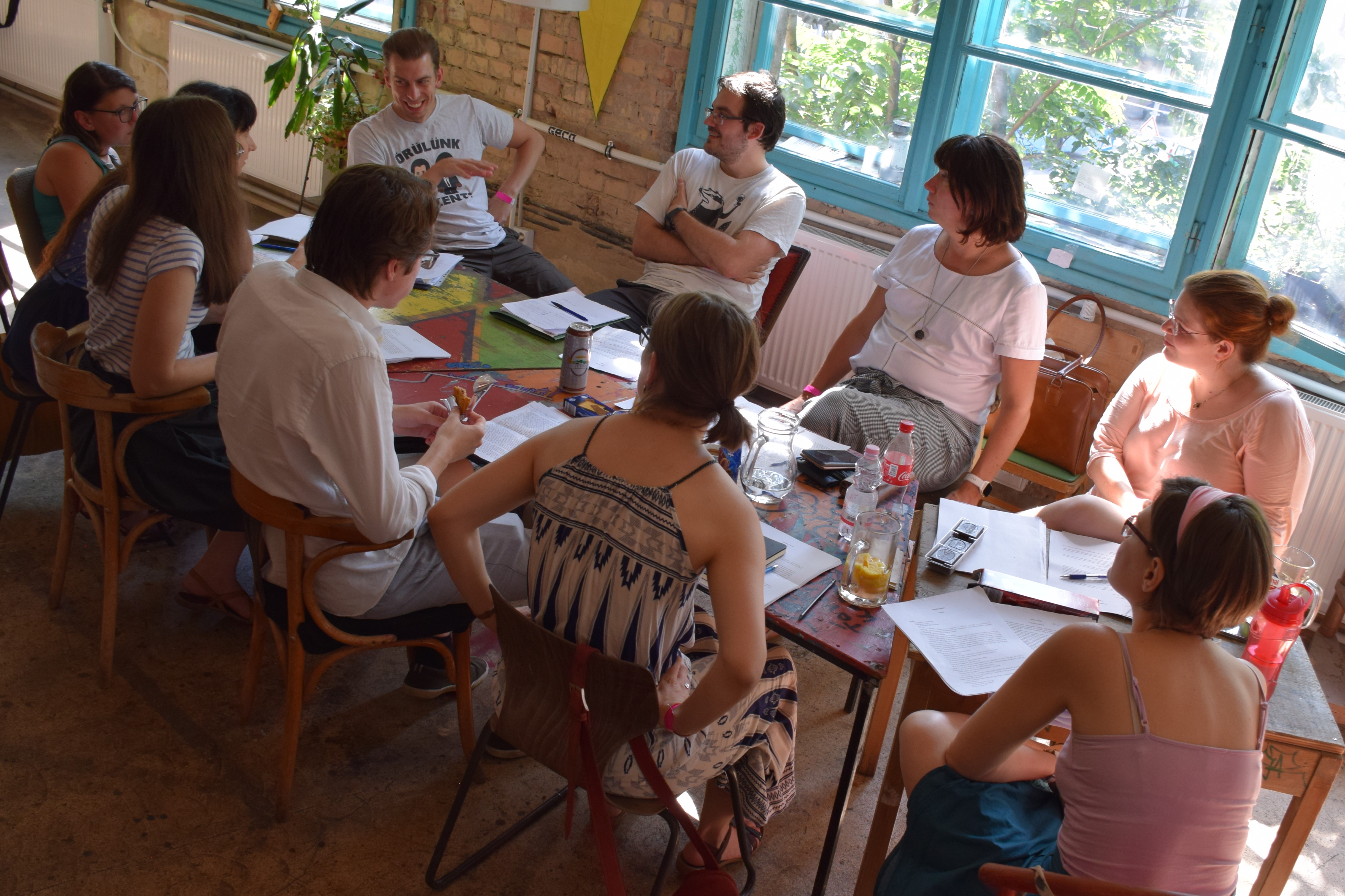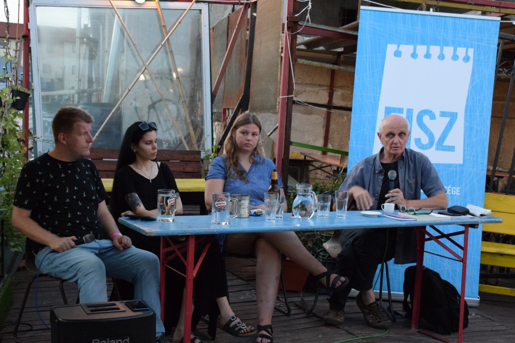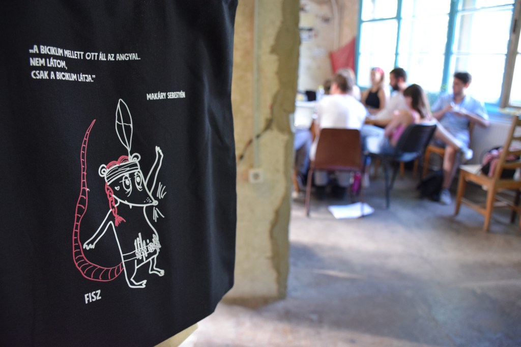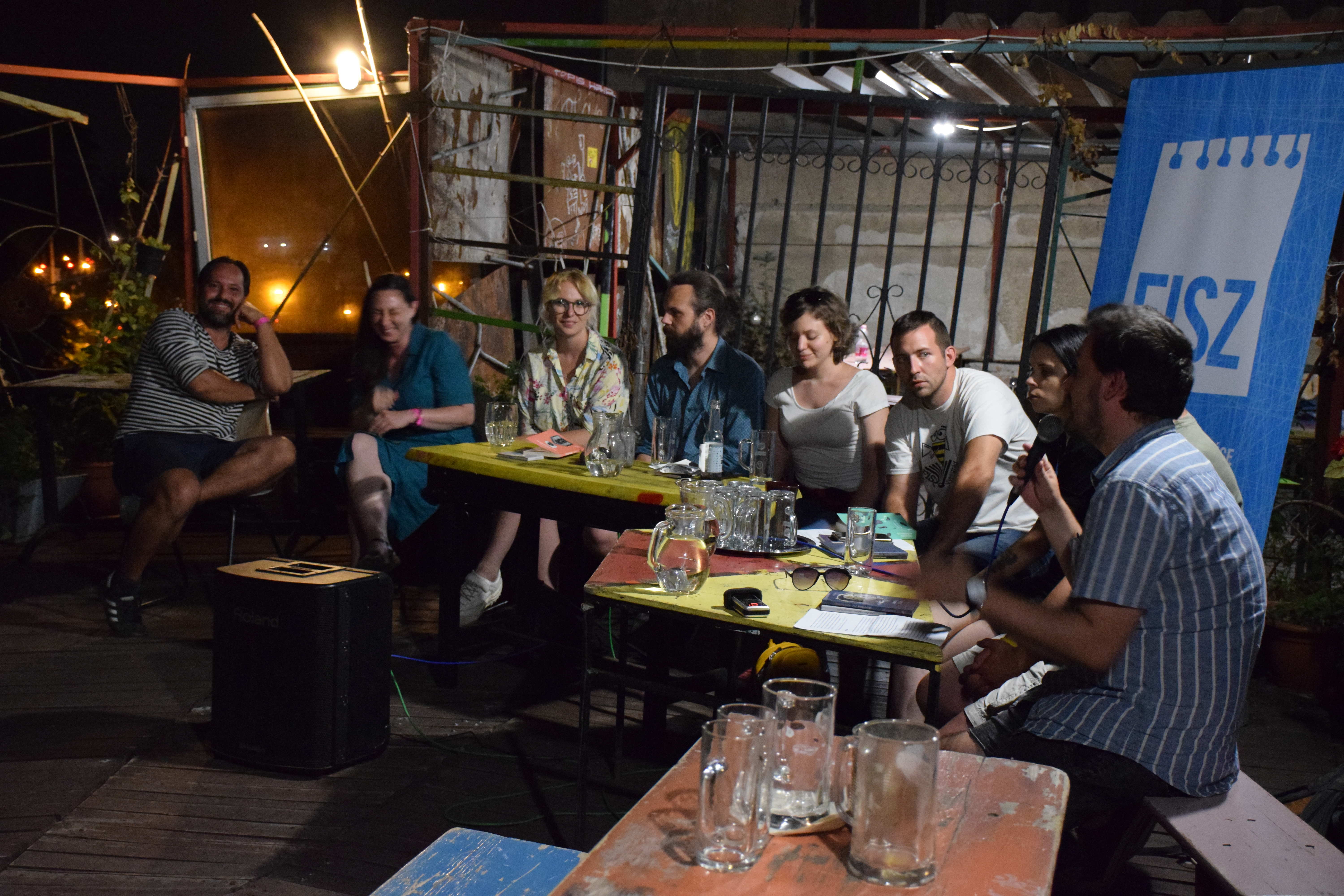 Dénes Gergő: Csütörtök reggel szándékosan korábban indultam, hogy legyen időm megtalálni a három napos eseménynek otthont adó Gólya Presszót. Ez igazából nem is volt nehéz; a mobilos térkép segítségével percek alatt rábukkantam a színes fémajtóra, melyen a FISZ-tábor plakátja függött. Az épület, amelybe beléptem, valami ipari raktárféle lehetett egykor; most romos stílusú bár és rendezvényközpont. A kellemesen hűs földszinten regisztráltak, és azt mondták, menjek fel a tetőre, mert ott lesz az eligazítás. Mint kiderült: az első napon nem csak én igyekeztem időben érkezni; felérve a girbegurba fapallóval fedett tetőteraszra, láttam, hogy milyen sokan várnak már a kezdésre. Néhány pillanat múlva a tábor szervezői köszöntöttek minket, bemutatták a műhelygyakorlatok vezetőit, és ismertették a napirendet. A jelentős számú érdeklődő miatt nyolc munkacsoport felállítására volt szükség, melyek egymással párhuzamosan ültek össze két-két órára ebéd előtt, illetve után. A legtöbben az árnyékos földszinten vagy a bárpulttal felszerelt első emeleten tartottak foglalkozást, de voltak olyanok is, akik az egyre forrósodó levegő ellenére a tetőn maradtak. Egy ideig magam is elüldögéltem ott; néztem, hogyan készülődik a két líracsoport, melyeket Terék Anna és Nádasdy Ádám neve fémjelzett. Sajnos nem bírtam sokáig az erős napsütést, így egy emelettel lejjebb kellett költöznöm, oda, ahol két prózacsoport kezdte épp a munkát. Az egyiket Bán Zsófia, a másikat Kiss Tibor Noé vezette; találomra az előbbi társasághoz csatlakoztam. Rövid ismerkedés után az előre beküldött szövegek felolvasása és fejlesztő szándékú boncolgatása következett. Ez a gyakorlat az egyetemi kreatív írás szemináriumokra emlékeztetett a leginkább; igaz, itt nem félévek, csupán félnapok álltak rendelkezésre. Hamar el is szaladt az idő, és tálalták az ebédet. Evés közben beszélgettem egy keveset az asztaltársaimmal; érdekelt, hogy ki miért jelentkezett a táborba. Mint megtudtam: van, akinek ez már a sokadik alkalom és legfőképp a jó társaságért jött, van, aki már publikáló szerző, de szeretne még csiszolni a technikáján, és van, aki épp azt fontolgatja, hogy talán már nem csak a fióknak kéne írnia. A foglalkozásokat mindenki hasznosnak tartotta, már az első néhány óra alapján is. A délutáni alkalomra egy korsó hideg sörrel ültem le. A program ugyanaz volt, mint korábban, hiszen az ilyen részletes elemzéshez idő kell, szövegből pedig nem volt hiány. Bár a nagy melegben csak nehezen lehetett lélegzethez jutni, mindenki aktívan részt vett a diskurzusban. Persze, amikor a szervezők szóltak, hogy mindjárt jön az első beszélgetős program a teraszon, örömmel indultunk a bárpulthoz valami frissítőért, amit aztán magunkkal vittünk a tetőre. Odafent sem volt hűvösebb, de legalább mozgott egy kicsit a levegő. Az öt órakor kezdődő beszélgetés vendégei Enyedi Ildikó és Wilhelm Droste voltak, a társalgás fő témáját pedig Enyedi legújabb filmje, A feleségem története képezte. Szó esett az adaptáció nehézségeiről, a filmkészítés gyakorlati problémáiról és a nyelvi különbségekről. Közben kezdett lemenni a nap, és mire elérkezett a vacsoraidő, már egészen kellemes volt a klíma.