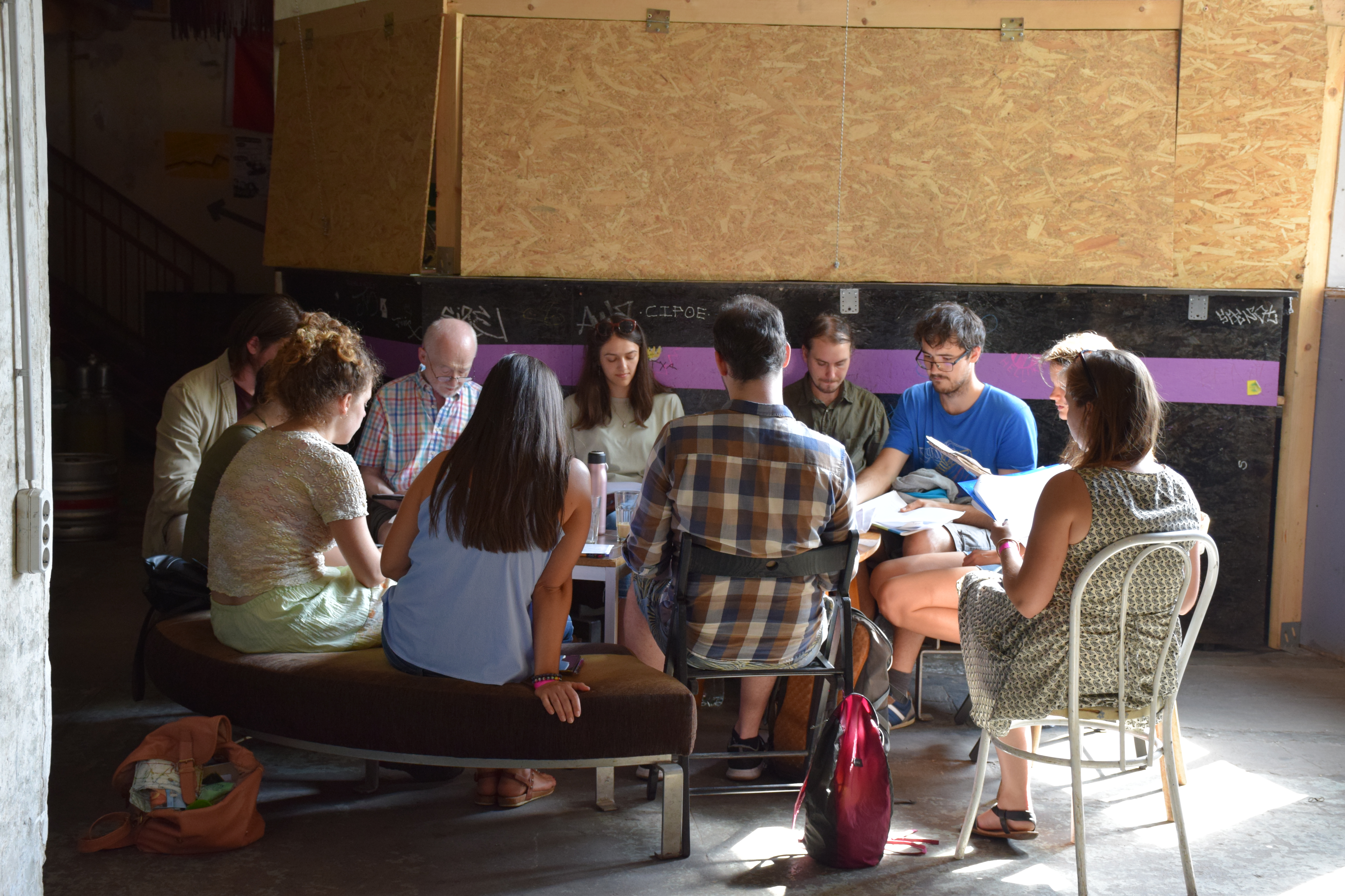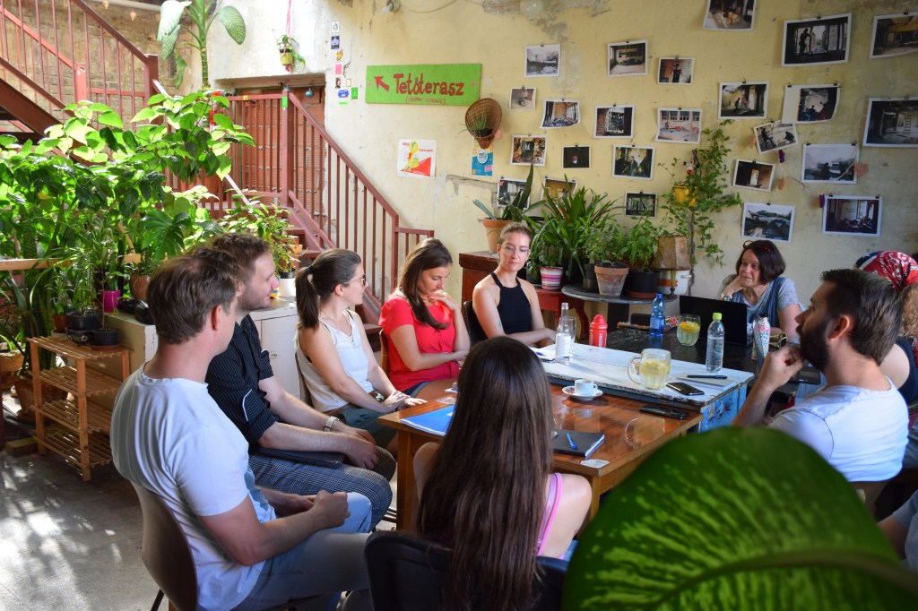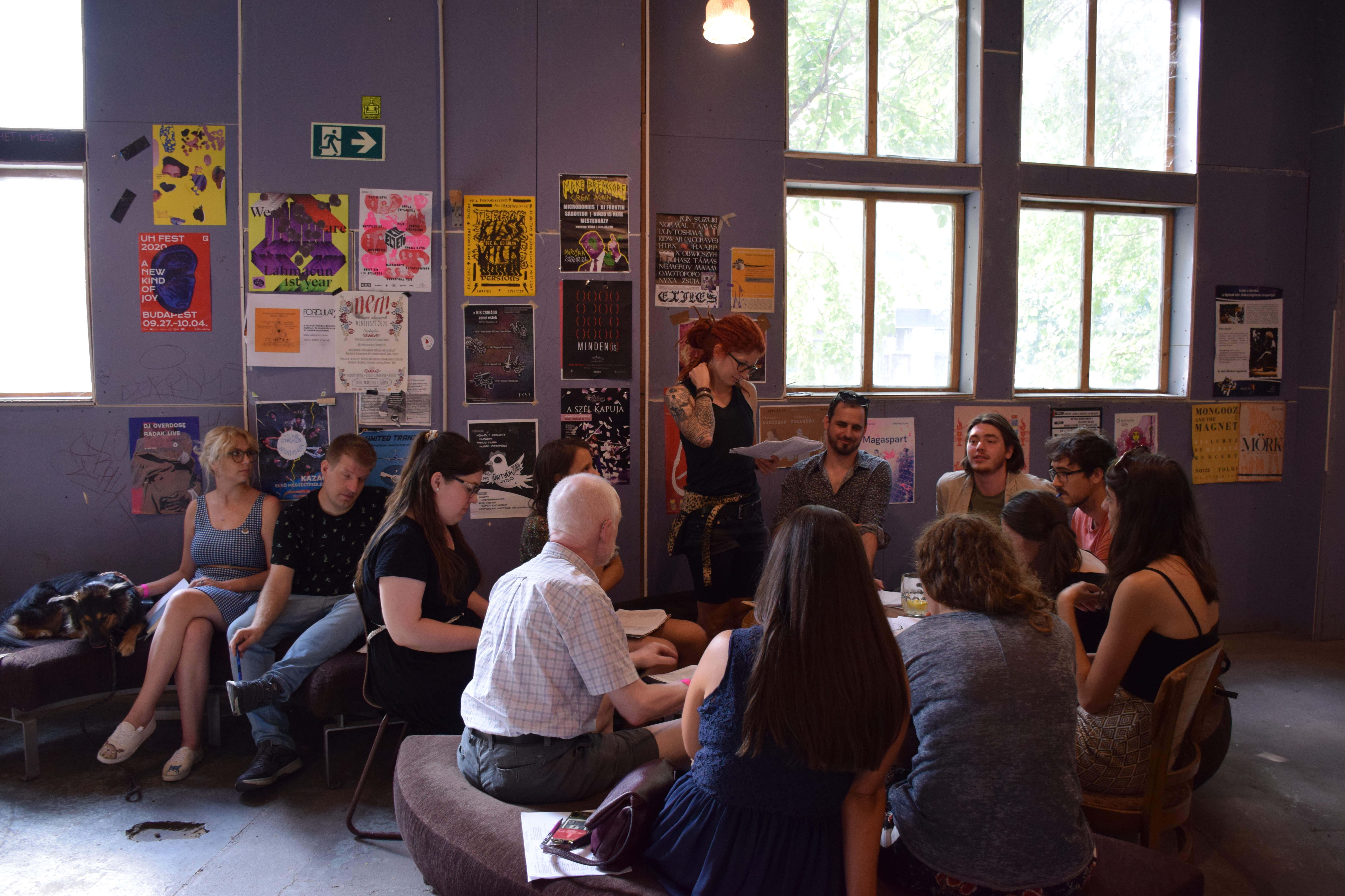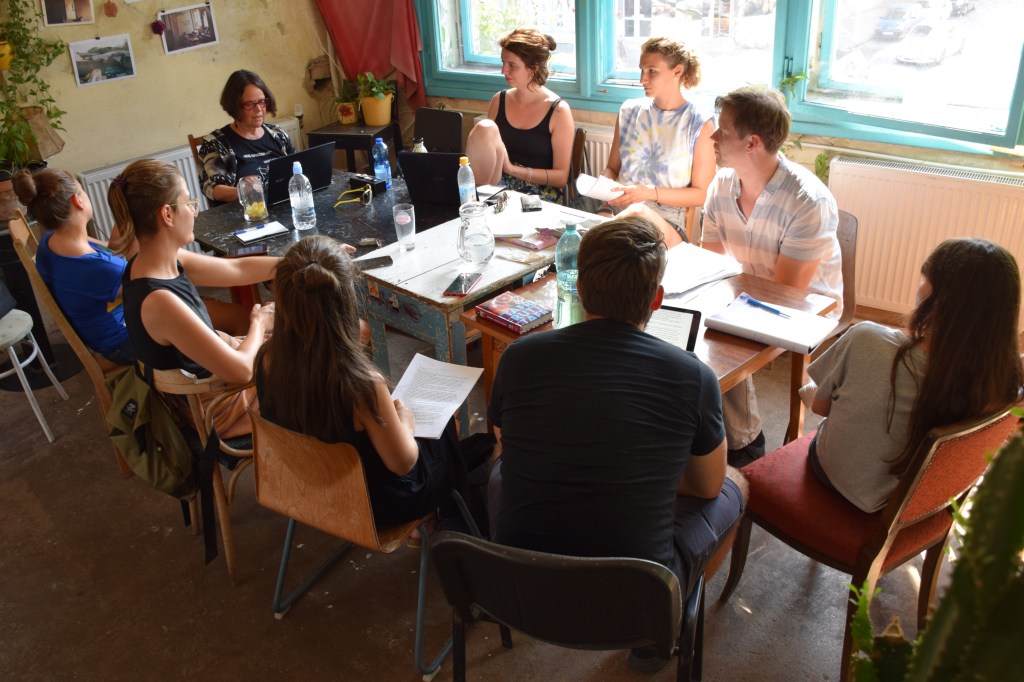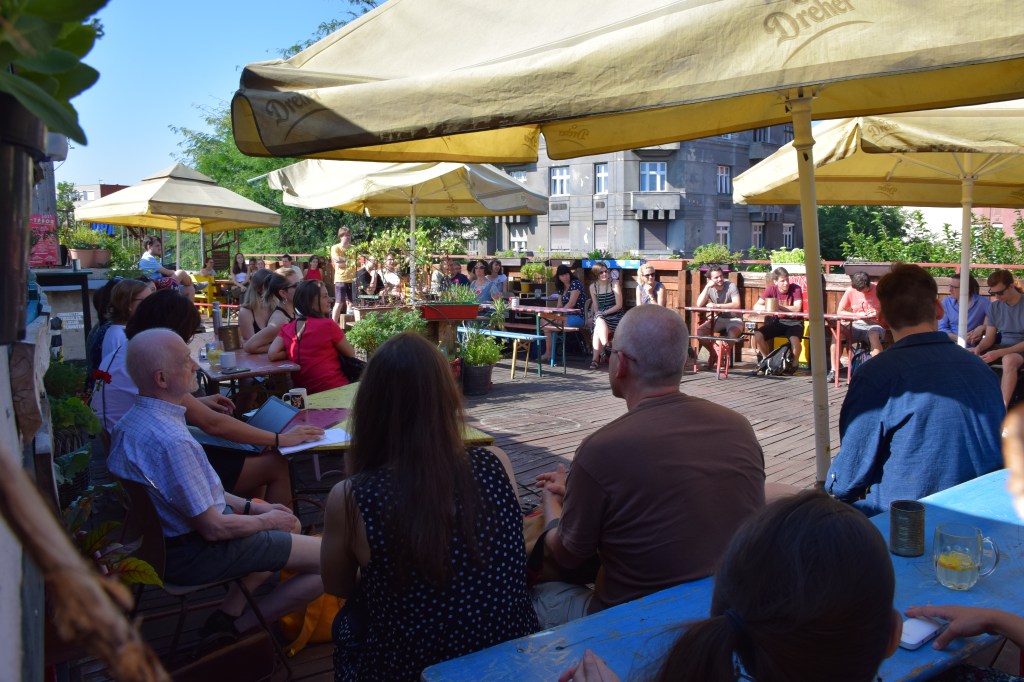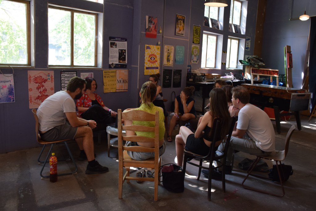 Dénes Gergő: Csütörtök reggel szándékosan korábban indultam, hogy legyen időm megtalálni a három napos eseménynek otthont adó Gólya Presszót. Ez igazából nem is volt nehéz; a mobilos térkép segítségével percek alatt rábukkantam a színes fémajtóra, melyen a FISZ-tábor plakátja függött. Az épület, amelybe beléptem, valami ipari raktárféle lehetett egykor; most romos stílusú bár és rendezvényközpont. A kellemesen hűs földszinten regisztráltak, és azt mondták, menjek fel a tetőre, mert ott lesz az eligazítás. Mint kiderült: az első napon nem csak én igyekeztem időben érkezni; felérve a girbegurba fapallóval fedett tetőteraszra, láttam, hogy milyen sokan várnak már a kezdésre. Néhány pillanat múlva a tábor szervezői köszöntöttek minket, bemutatták a műhelygyakorlatok vezetőit, és ismertették a napirendet. A jelentős számú érdeklődő miatt nyolc munkacsoport felállítására volt szükség, melyek egymással párhuzamosan ültek össze két-két órára ebéd előtt, illetve után. A legtöbben az árnyékos földszinten vagy a bárpulttal felszerelt első emeleten tartottak foglalkozást, de voltak olyanok is, akik az egyre forrósodó levegő ellenére a tetőn maradtak. Egy ideig magam is elüldögéltem ott; néztem, hogyan készülődik a két líracsoport, melyeket Terék Anna és Nádasdy Ádám neve fémjelzett. Sajnos nem bírtam sokáig az erős napsütést, így egy emelettel lejjebb kellett költöznöm, oda, ahol két prózacsoport kezdte épp a munkát. Az egyiket Bán Zsófia, a másikat Kiss Tibor Noé vezette; találomra az előbbi társasághoz csatlakoztam. Rövid ismerkedés után az előre beküldött szövegek felolvasása és fejlesztő szándékú boncolgatása következett. Ez a gyakorlat az egyetemi kreatív írás szemináriumokra emlékeztetett a leginkább; igaz, itt nem félévek, csupán félnapok álltak rendelkezésre. Hamar el is szaladt az idő, és tálalták az ebédet. Evés közben beszélgettem egy keveset az asztaltársaimmal; érdekelt, hogy ki miért jelentkezett a táborba. Mint megtudtam: van, akinek ez már a sokadik alkalom és legfőképp a jó társaságért jött, van, aki már publikáló szerző, de szeretne még csiszolni a technikáján, és van, aki épp azt fontolgatja, hogy talán már nem csak a fióknak kéne írnia. A foglalkozásokat mindenki hasznosnak tartotta, már az első néhány óra alapján is. A délutáni alkalomra egy korsó hideg sörrel ültem le. A program ugyanaz volt, mint korábban, hiszen az ilyen részletes elemzéshez idő kell, szövegből pedig nem volt hiány. Bár a nagy melegben csak nehezen lehetett lélegzethez jutni, mindenki aktívan részt vett a diskurzusban. Persze, amikor a szervezők szóltak, hogy mindjárt jön az első beszélgetős program a teraszon, örömmel indultunk a bárpulthoz valami frissítőért, amit aztán magunkkal vittünk a tetőre. Odafent sem volt hűvösebb, de legalább mozgott egy kicsit a levegő. Az öt órakor kezdődő beszélgetés vendégei Enyedi Ildikó és Wilhelm Droste voltak, a társalgás fő témáját pedig Enyedi legújabb filmje, A feleségem története képezte. Szó esett az adaptáció nehézségeiről, a filmkészítés gyakorlati problémáiról és a nyelvi különbségekről. Közben kezdett lemenni a nap, és mire elérkezett a vacsoraidő, már egészen kellemes volt a klíma.