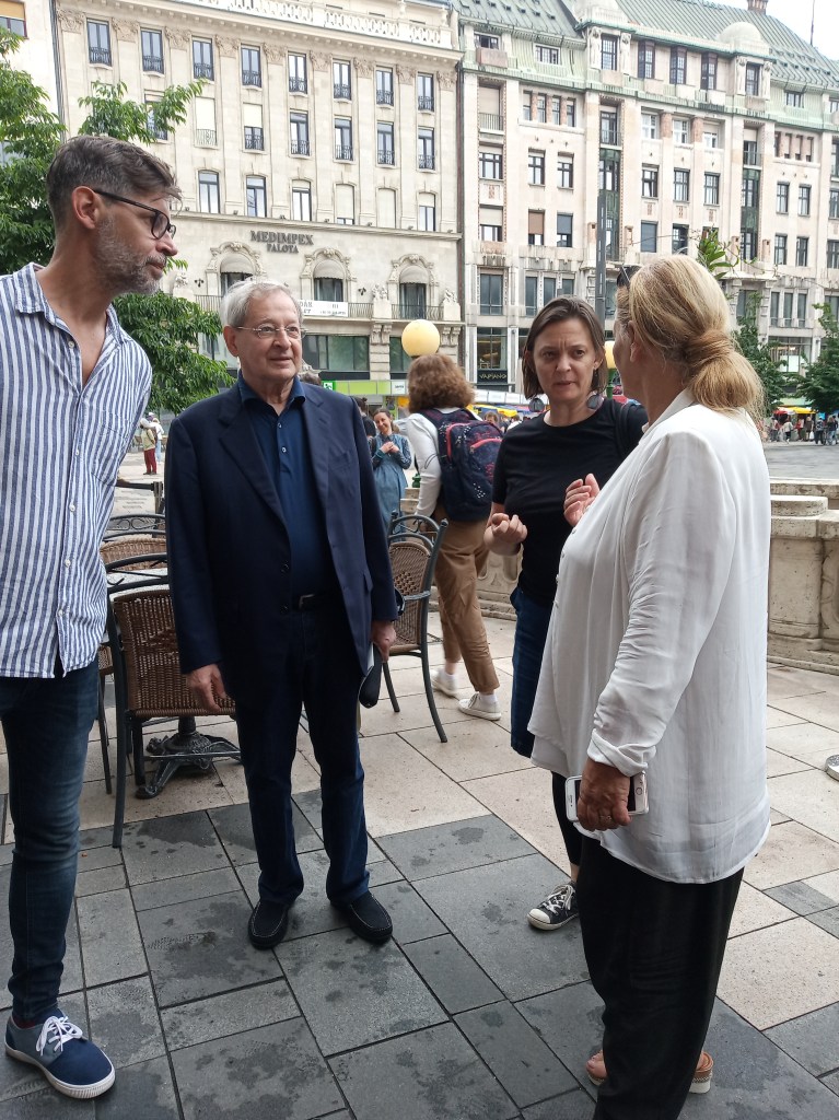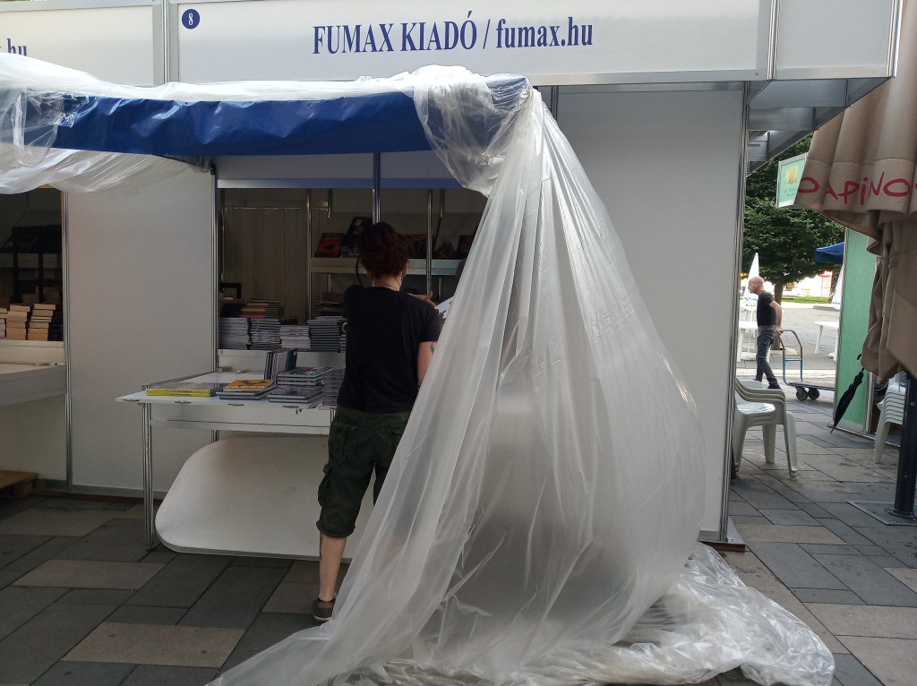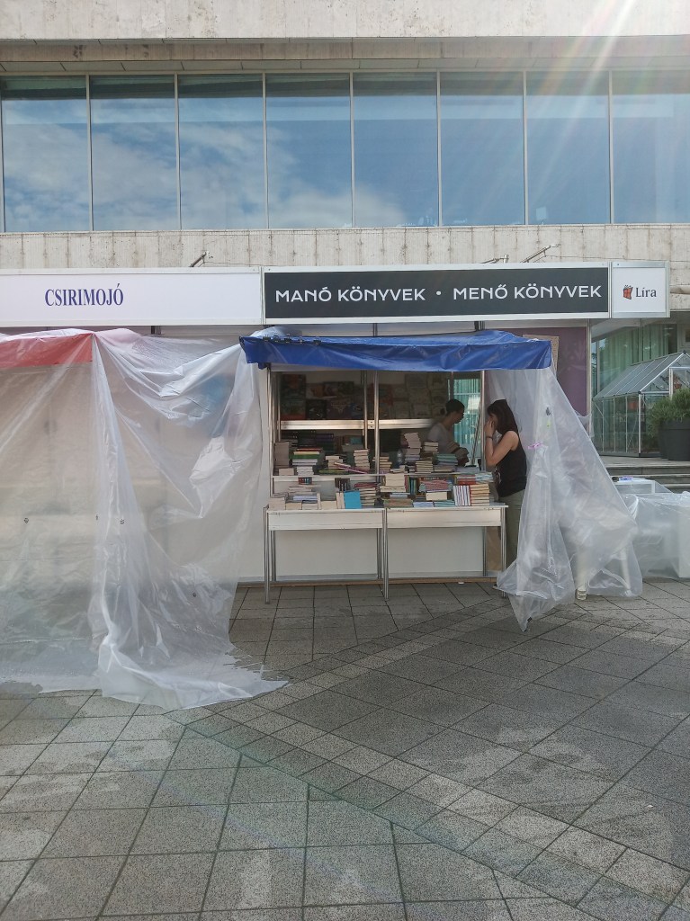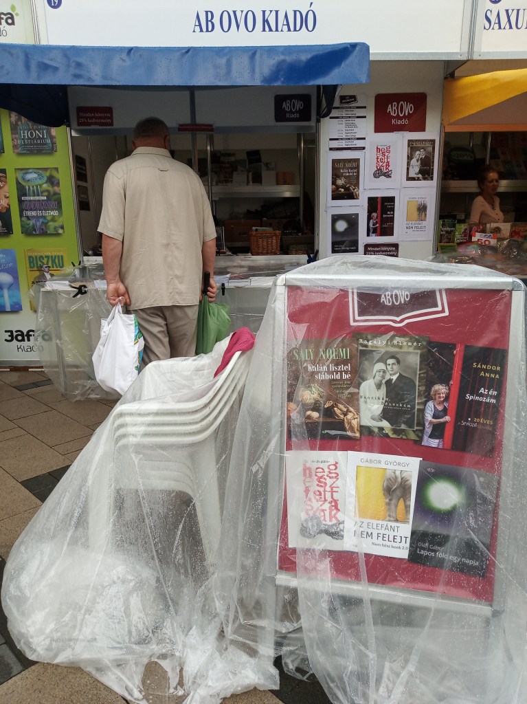 Idő közben az áramvételi aknában megáll a víz, a katasztrófavédelem még nem tud kiszállni. A Magvető standjánál Lacival már csak egymásra mosolygunk: bankkártya terminálom nincs, de mosolyom igen. Látom ahogyan kitartanak a látogatók, behúzódnak az esőben, jönnek, válogatnak, érdeklődnek, ahogy eláll. Kitartanak a szerzők, akik ebben a viszontagságos, kiszámíthatatlan időjárásban is vidáman fogadják az olvasóikat, örömmel dedikálnak és invitálnak.
