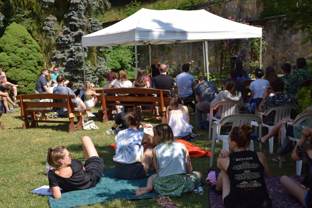Persze nem csak írni jöttünk, egyéb programmal is készültek a szervezők. Az első műhelyfoglalkozás után alig volt pár percünk, máris kezdődött Mán-Várhegyi Réka és Antal Nikolett beszélgetése. Szó esett többek között a tér és a szociális helyzet kapcsolatáról Mán-Várhegyi műveiben, a női karakterekről és arról, hogy miként ír regényt egy kisgyermekes édesanya. A jó hangulatú diskurzust közös vacsora követte, majd újból helyet foglaltunk a szálloda épülete mögötti téren, ahol Bán-Horváth Veronika moderálásával Gondos Mária Magdolna, Balogh Gergő, Barlog Károly és Sirokai Mátyás meséltek nekünk a FISZ-könyvek szerkesztésének részleteiről. Alkonyodott, és egyre több lett körülöttünk a szúnyog. Bántam, hogy a sátramban hagytam a rovarriasztó sprét. A nap eltűnt a hegyek mögött, a levegő lehűlt. A szúnyogok dolguk végeztével tovább szálltak, mi maradtunk. Az éjjeli bulit az ÉN zenekar nyitotta. Őket még meghallgattam, de aztán erőt vett rajtam a fáradtság, melyet az utazás meg az első nap sok újdonsága okozott, és elbúcsúztam a társaságtól. Bizonyos értelemben viszont még így sem maradtam ki a buliból, hisz még a sátorba is sokáig beszűrődött a zene dübögése.