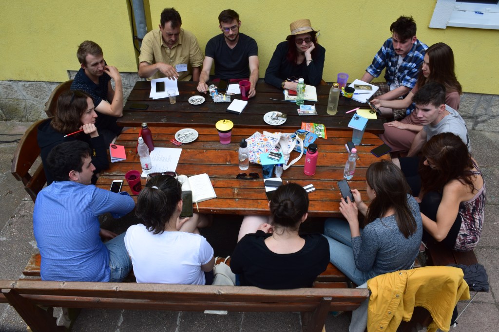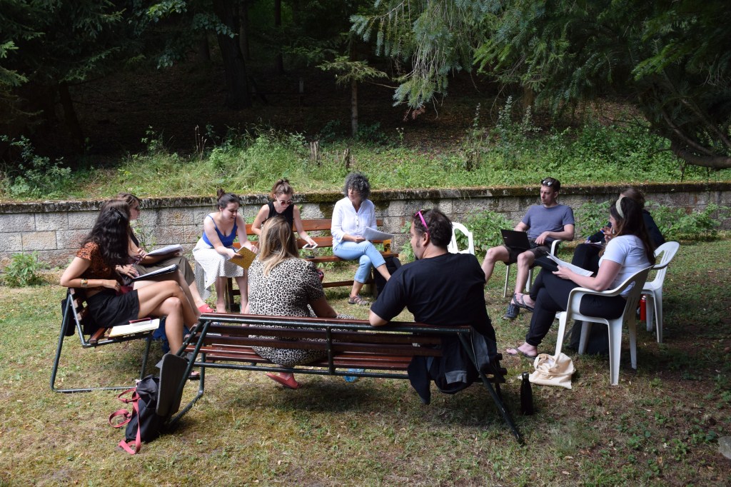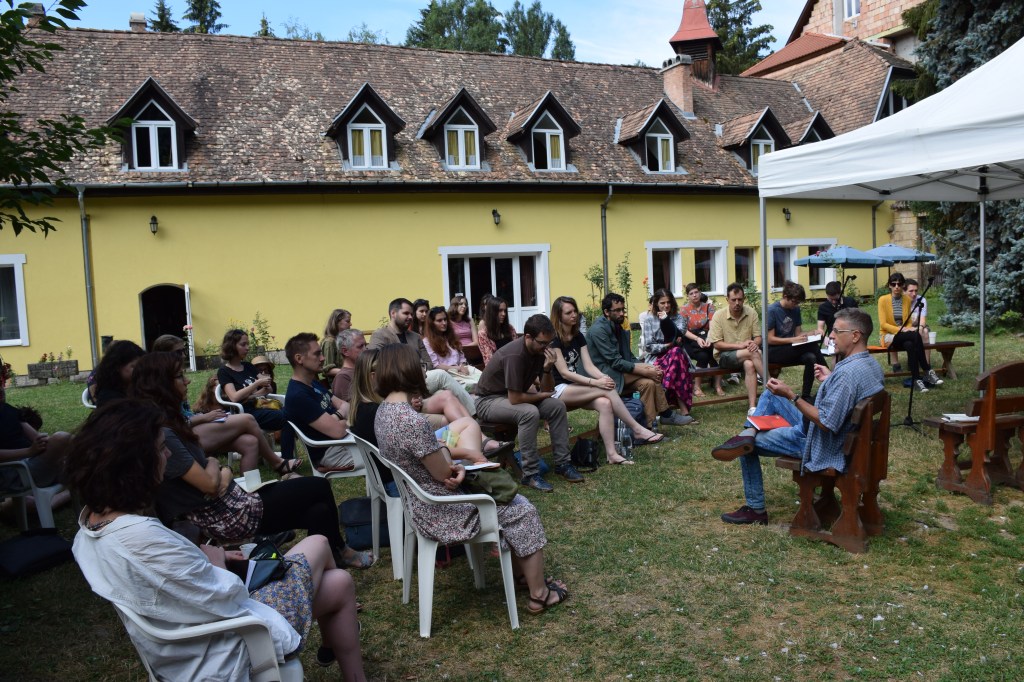 Délután kezdetüket is vették a szakmai gyakorlatok. A FISZ-táborok résztvevői általában pályakezdő költők, írók, kritikusok és szerkesztők, akik szívesen tanulnak tapasztaltabb kollégáiktól. Erre a műhelyszemináriumokon van lehetőség. A csoportok elvonulnak a kastélyszálló parkjának rejtett szegleteibe, ahol felolvassák egymásnak írásaikat. A táborozók friss szemmel tekintenek társaik szövegeire, és hasznos meglátásokkal, szerkesztői tippekkel segítenek azok finomításában. Ezen kívül érdekes, a kreativitást serkentő gyakorlatokat is végeznek, sőt van olyan műhelyvezető, aki még házi feladatot is ad másnapra.
