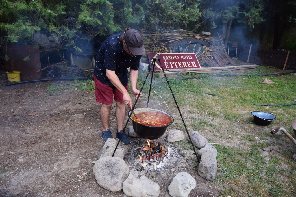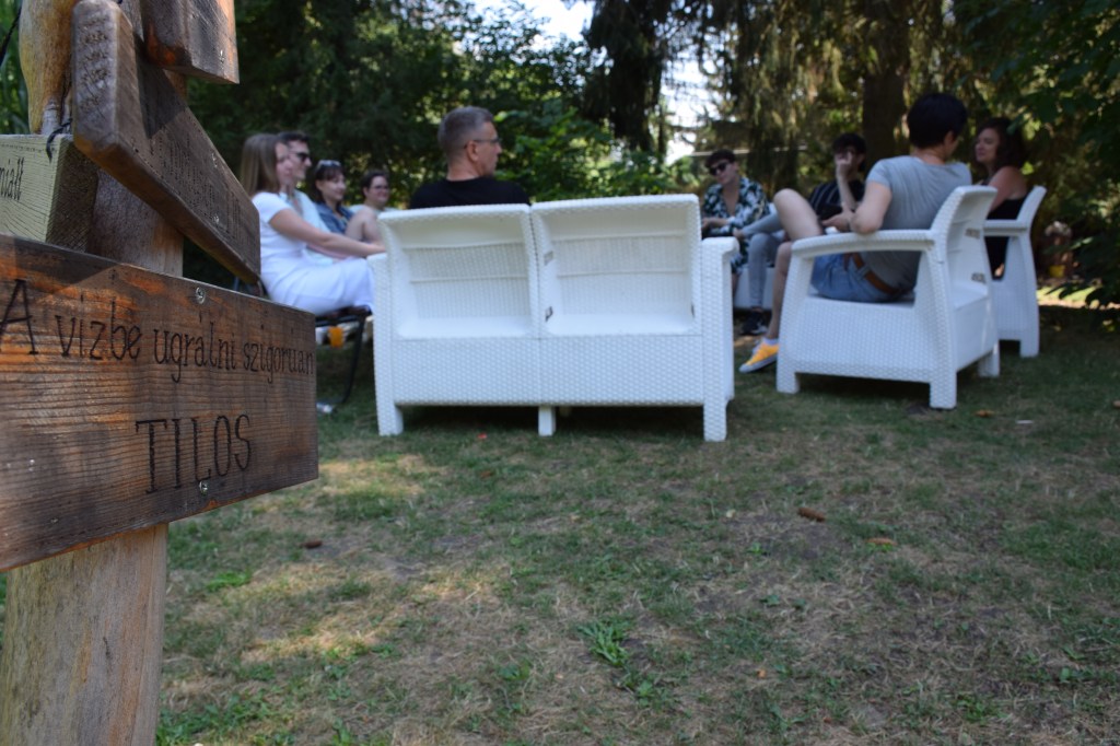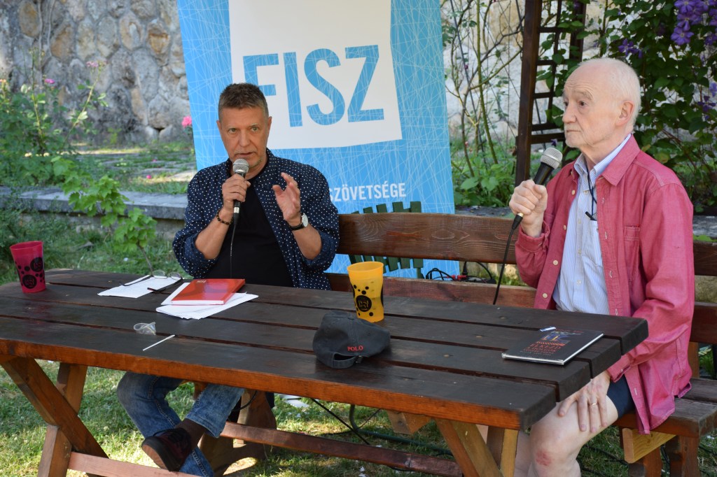 A vacsora végére már elállt az eső, így a kerekasztalnak megint a kertben futottunk neki. Ez lényegében egy kihelyezett Késelés Villával est volt, hiszen Vida Kamilla és Csete Soma kérdezték a FISZ egykori és jelenlegi elnökeit, társelnökeit arról, hogyan is született, és azóta miként működik ez a szervezet. Antal Nikolett, Kollár Árpád és L. Simon László egyetértettek abban, hogy egy irodalmi közösségben nem a tagok politikai nézete, hanem a szövegeik minősége és a kultúra iránti elkötelezettség az elsődleges. A sok emlék és közéleti kitérő miatt azonban úgy elhúzódott az eredetileg másfél órásra tervezett program, hogy ránk sötétedett. Hideg volt, de kitartottunk. Megérte, mivel a beszélgetés végén a fiszesek bejelentették, hogy a kastélyszálló épületében Deczki Sarolta bográcsos tikka massalája és Cserna-Szabó András fantasztikus vaddisznópörköltje vár minket.