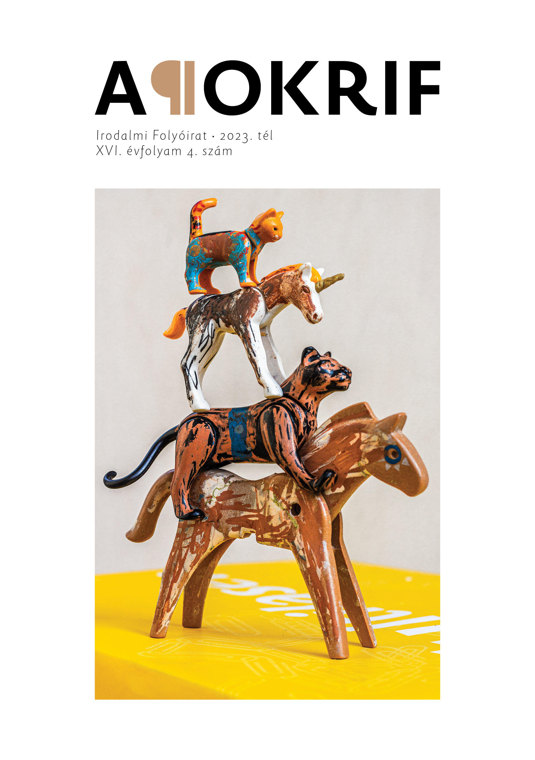 Hamarosan megjelenik az Apokrif idei negyedik lapszáma. Folyóiratunk 2023. téli kiadásának versrovatában Biró Erika, Bödecs László, Faragó Dániel, Sajó László, Simon Márton, Szabolcsi Viktória, Tábor Ádám és Veszprémi Szilveszter művei kaptak helyet, míg prózát Istók Annától, Littner Zsolttól és Ocsenás Péter Bencétől közlünk. Látószög rovatunkban szerkesztőnk, Veress Dániel a lapszámban bemutatott fényképek és festmények készítőjével, Puklus Péterrel beszélget. Kritikát Kemény Zsófi, Körtesi Márton és K. Varga Bence legutóbbi könyveiről közlünk.