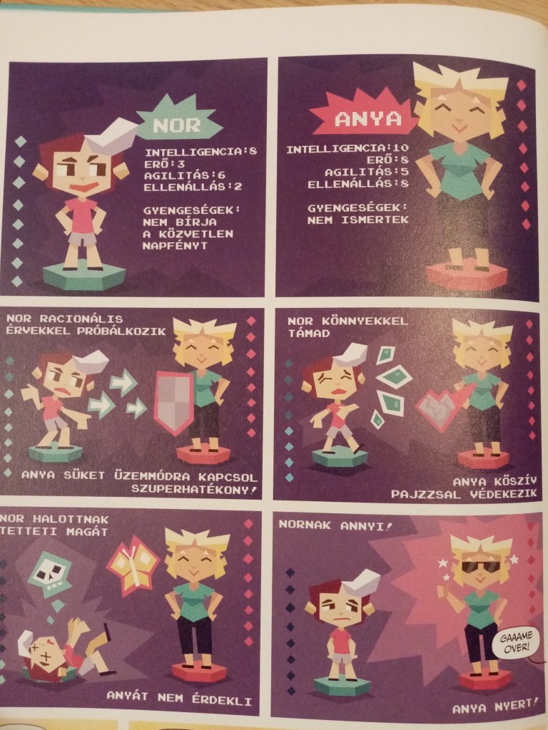 A képregény az elején találóan ábrázolja az anyával vívott csatát, melyben Nor dacosan ellenkezik a vidékre való utazással kapcsolatban, mivel videójátékozni szeretne egész nyáron. A videójáték médiumi sajátosságait felhasználva ábrázolja Nort és anyukáját és így kerül bemutatásra a szócsata, ezzel is rájátszva egyrészt a gyerekperspektívára, másrészt a vita tárgyára, mivel vidéken nem játszhat majd Nor a videójátékával.