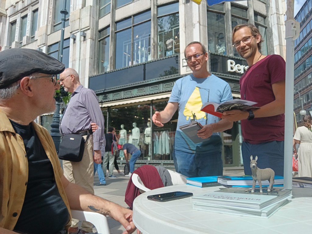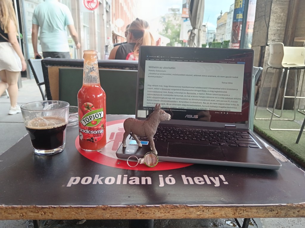 Kicsit pihennünk kellett. Beültünk a Deák téri Ördögbe. A Topjoy kupakjába az van beleírva, hogy „nyiss új fejezetet!”. Ez némi hermeneutikai problémát okoz. Ugrándozom a billentyűkön. Estig be kell gépelnem a jegyzeteimet. Persze még nincs vége, megyünk is vissza. Olyanok vagyunk, mint a brémai muzsikusok! Épp most sétálunk el a dedikáló Puzsér Róbert mellett! De persze ügyet sem vetünk rá, mert mi megint a rejtettebbet, bár ezúttal híres énekmondónkat, Száz Pált keressük.