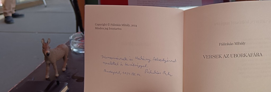 Hogy jobban felvidámítsam, orrommal a dedikáló Pálinkás Mihály felé böktem. Akkor persze még nem tudtam, hogy így hívják, de messziről látszott rajta, hogy egy peremen álló öreg csodabogár. Van aki ismeri? Pedig generációk nőttek fel a munkáján. Nyugdíjas tankönyvszerkesztő. Rákérdeztem, a régi, középiskolai Szárayt is – amit annyit forgattam az egyetemi történelemvizsgáim előtt – ő szerkesztette. Hallgatag költő, egy csendes, vidéki Orfeusz. Egész életében mások gondolatait segítette könyvvé válni, és most, hogy nyugdíjas, kiadatta versei válogatását. Megérint a találkozás, nem tudom, mi lehet ez. Az ilyen alakok mindig különös erővel hatnak rám. Látom, útitársam is egészen meg van hatódva, gyorsan megvesszük a könyvét – legszebb című könyv! Versek az uborkafára –, és közös dedikációt kérünk. Azt persze nem mondjuk el, hogy ízléstelen a borító, de mikor útitársam oldalba bökött, éreztem, hogy szerinte is erősen Aranypaprika díjat érdemelne.