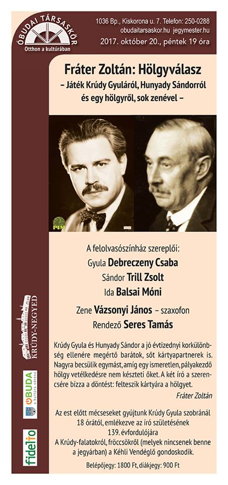 Lapunk alapító szerkesztője, Fráter Zoltán legújabb színpadi műve, a Hölgyválasz (Játék Krúdy Gyuláról, Hunyady Sándorról és egy hölgyről, sok zenével) … (tovább…)